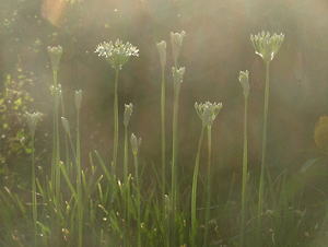 ラジオ体操から帰ってくると、にらの花が咲いています。